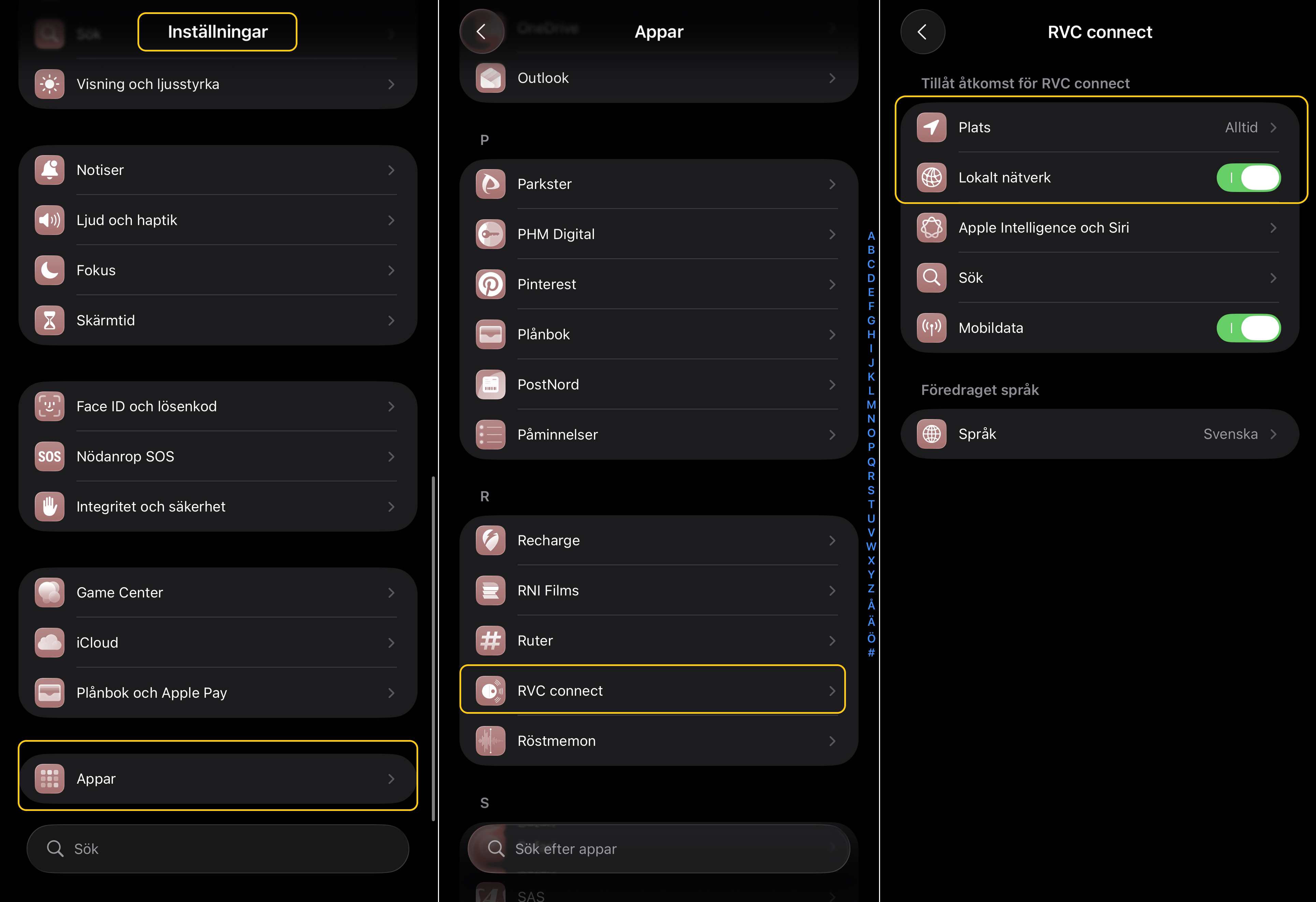 - Kontroller at du har godkjent posisjonstilgang i mobilens innstillinger. Hvis du bruker iOS 14 eller nyere (anbefales), aktiver lokal nettverkstilgang for appen. Se bilde.